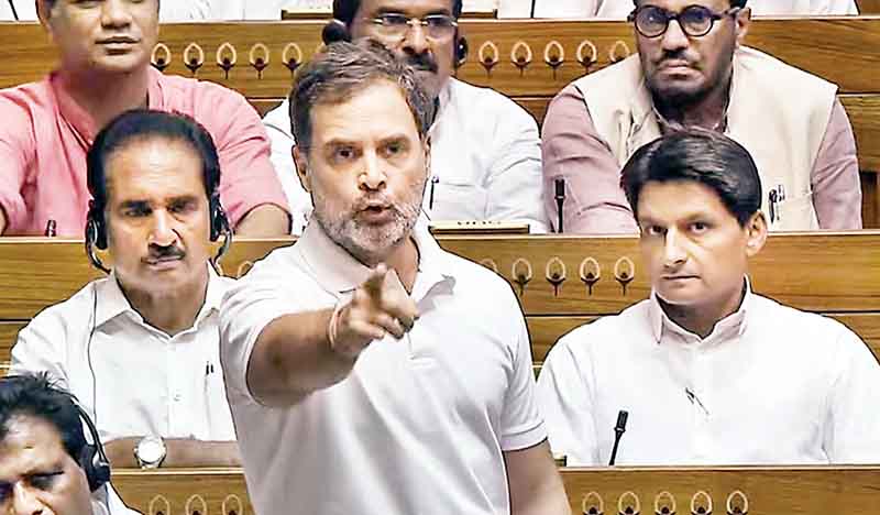 लोकसभा में विपक्ष के नेता बनने के बाद कांग्रेस नेता राहुल गांधी ने सदन में 90 मिनट के अपने पहले भाषण में राष्ट्रीय जनतांत्रिक गठबंधन (राजग) सरकार पर तीखा हमला करते हुए कहा कि प्रधानमंत्री नरेंद्र मोदी देश में हर वर्ग एवं व्यक्ति को डराते हैं, जबकि कांग्रेस का निशान भगवान शिव, इस्लाम, गुरु नानक, महात्मा बुद्ध, महावीर की ‘अभय मुद्रा’ ह,ै जो देश में सत्य, अङ्क्षहसा और निर्भयता फैला रहा है। राष्ट्रपति अभिभाषण पर चर्चा में विपक्ष की अगवाई करते हुए राहुल गांधी ने डेढ़ घंटे से अधिक के भाषण में भारतीय जनता पार्टी पर तीखे प्रहार किए और केंद्रीय एजेंसियों के दुरुपयोग, बेरो•ागारी, महंगाई, अग्निवीर, मणिपुर हिंसा, नीट, किसान आंदोलन आदि मुद्दों पर सरकार को घेरा और स्वयं लोकसभा अध्यक्ष ओम बिड़ला पर भी कटाक्ष किए। राहुल गांधी के भाषण के दौरान दो बार प्रधानमंत्री को हस्तक्षेप करना पड़ा, जबकि गृह मंत्री अमित शाह ने तीन बार और रक्षा मंत्री राजनाथ ङ्क्षसह एवं कृषि एवं ग्रामीण विकास मंत्री शिवराज ङ्क्षसह चौहान को एक-एक बार हस्तक्षेप करना पड़ा। इस दौरान लोकसभा की दर्शक दीर्घा में कांग्रेस संसदीय दल की नेता सोनिया गांधी और कांग्रेस महासचिव प्रियंका गांधी भी बैठीं थीं। उन्होंने भगवान शंकर, गुरु नानक देव, महात्मा बुद्ध, महावीर, इस्लाम में इबादत के हाथों की तस्वीरें दिखाईं और भाजपा पर ङ्क्षहसा एवं नफरत फैलाने का आरोप लगाया, लेकिन एक बयान से स्वयं राहुल गांधी को भी सदन का रोष झेलना पड़ा, जब उन्होंने कहा कि जो खुद को हिंदू कहते हैं, वे हिंसा और नफरत फैला रहे हैं। श्री गांधी के इस बयान के बाद सत्ता पक्ष के सांसदों के हंगामे के बीच स्वयं प्रधानमंत्री नरेंद्र मोदी उठ खड़े हुए और उन्होंने कहा कि पूरे हिंदू समाज को ङ्क्षहसक एवं नफरत फैलाने वाला कहना ‘गंभीर विषय’ है। सत्ता पक्ष के लोगों ने नियमों का हवाला देते हुए राहुल गांधी से कहा कि उन्होंने पूरे हिंदू समाज को ङ्क्षहसक कहा है, इसलिए उन्हें पूरे देश से माफी मांगनी चाहिए।