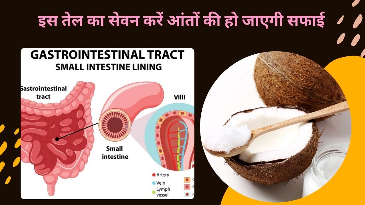 नारियल तेल में मध्यम श्रृंखला फैटी एसिड होते हैं जो पाचन को दुरुस्त करने में मदद करते हैं। इसका सेवन करने से मेटाबॉलिज्म बूस्ट होता है और आंतों को चिकनाहट मिलती है। इस तेल में एंटी-इन्फ्लेमेटरी और एंटी-माइक्रोबियल गुण मौजूद होते हैं जो आंतों की सूजन को कंट्रोल करते हैं और आंतों को हेल्दी बनाते हैं। इसके लैक्सेटिव गुण आंतों में जमा मल को बाहर निकालता है और आंतों को क्लीन करता है।