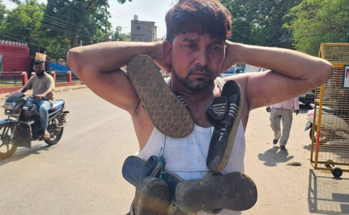 रेप से दोबारा प्रेग्नेंट हुई युवती' गुस्साए लोगों ने युवक को जूतों की माला पहनाई और पीटते हुए लेकर आए थाने.
