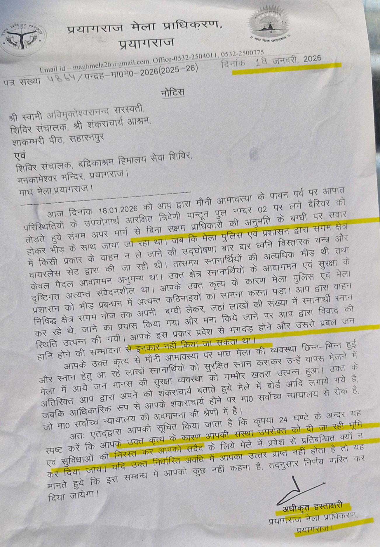 प्रयागराज मेला प्राधिकरण ने स्वामी अविमुक्तेश्वरानंद को अब तक कुल दो नोटिस भेजे हैं. 19 जनवरी को भेजे गए दूसरे नोटिस में उपाध्यक्ष ने सुप्रीम कोर्ट के तीन साल पुराने एक आदेश का हवाला देते हुए उनसे उनके शंकराचार्य होने का कानूनी सबूत मांगा था. 18 जनवरी के पहले नोटिस में भी उनके नाम के आगे शंकराचार्य लिखे जाने पर सुप्रीम कोर्ट की रोक का जिक्र किया गया है. स्वामी अविमुक्तेश्वरानंद की ओर से 19 जनवरी वाले नोटिस का आठ पन्नों का विस्तृत जवाब पहले ही भेजा जा चुका है.
