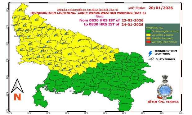 मौसम विभाग का कहना है कि 22 जनवरी से प्रदेश में बादलों की आवाजाही और बारिश शुरू हो जाएगी. इस दौरान 23 जनवरी को बारिश की तीव्रता सबसे अधिक रहेगी. यानी इस दिन यूपी के कई हिस्सों में तेज़ बारिश और गरज-चमक देखने को मिल सकती है. बारिश का यह पहला स्पेल 24 जनवरी तक जारी रहने की उम्मीद है.