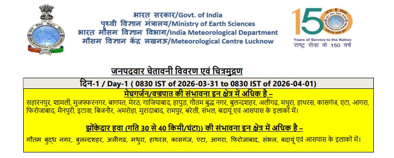 UP Weather Alert: मौसम विभाग की ताजा भविष्यवाणी ने उत्तर प्रदेश के कई जिलों के लिए चिंता बढ़ा दी है. अप्रैल की शुरुआत के साथ ही प्रदेश के पश्चिमी और मध्य इलाकों में मौसम का मिजाज पूरी तरह बदलने वाला है. विभाग ने 1 अप्रैल की सुबह 8:30 बजे तक (या इसके बाद भी) के लिए भारी बारिश और बिजली गिरने का येलो अलर्ट जारी किया है.